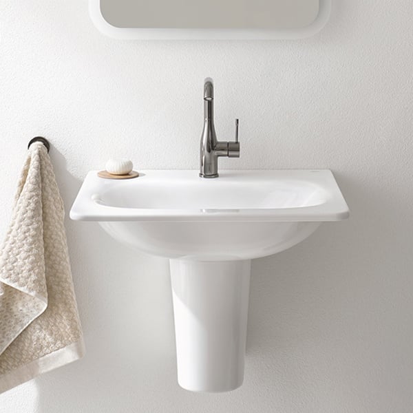 Lavabo treo tường GROHE có lỗ gắn ở mặt lưng để lắp trực tiếp vào tường và không tiếp xúc với sàn nhà, tạo ra khoảng trống bên dưới. Cả chậu rửa lẫn hệ thống đường ống đều được gắn chặt vào mặt tường nên người dùng sẽ không cảm thấy vướng víu dưới chân. Phần diện tích thừa ra còn có thể tận dụng để đặt các đồ dùng vệ sinh khác cực kỳ tiện lợi.
