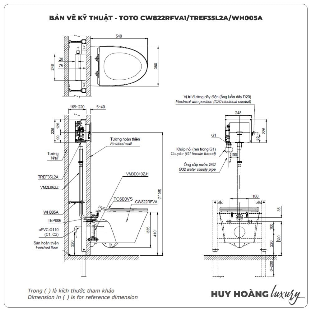 | Kết cấu | Thân cầu: CW822RFVA1 Nắp đóng êm: TC600VS Két nước âm tường: WH172A Van xả cảm ứng tự động: TREF35L2A |