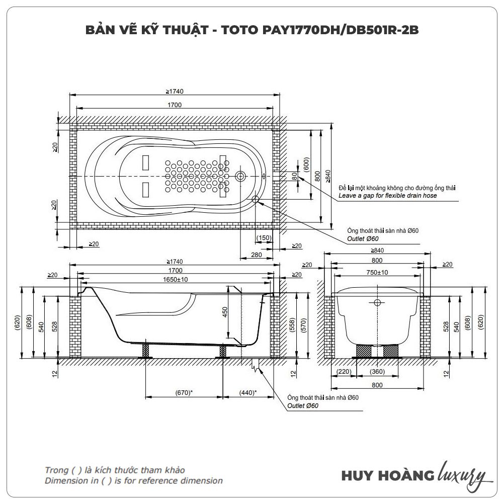 Thông tin sản phẩm: Bồn tắm xây TOTO PAY1770DH/DB501R-2B (1.7M)