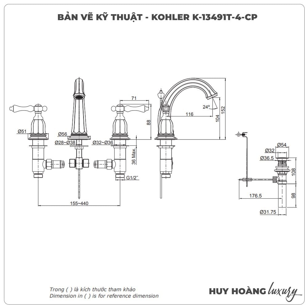Thông tin sản phẩm: Vòi lavabo nóng lạnh 3 lỗ KOHLER K-13491T-4-CP