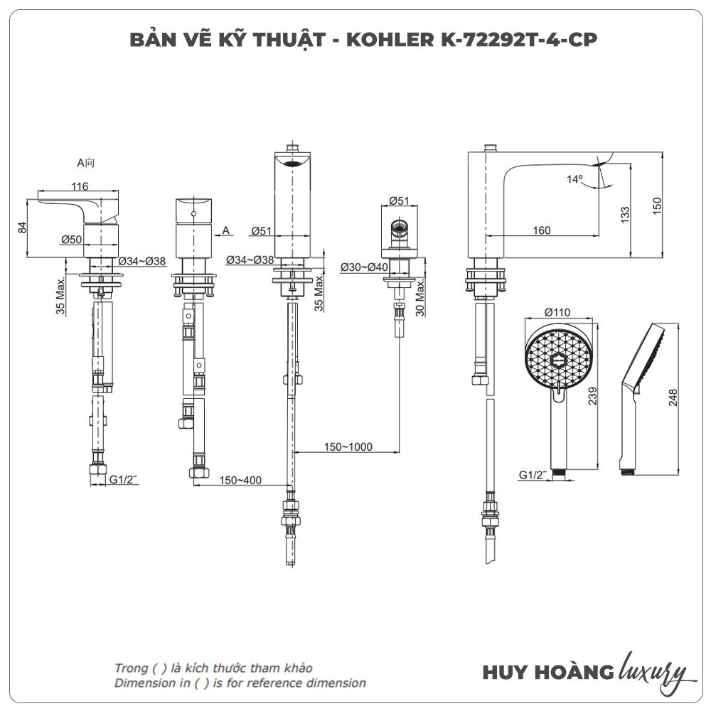 Thông tin sản phẩm: Vòi xả bồn tắm KOHLER K-72292T-4-CP 3 lỗ